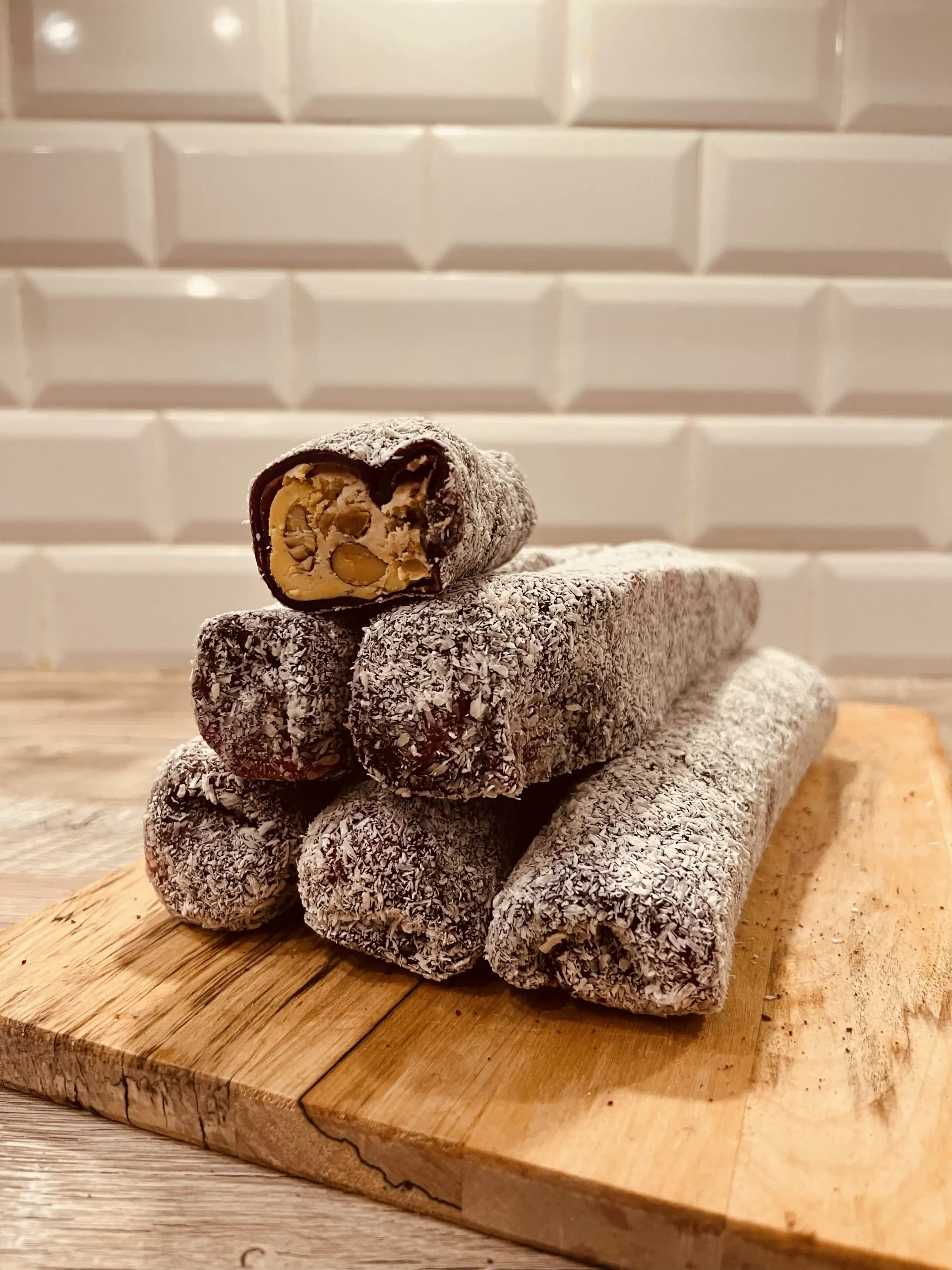 Hindistan cevizli böğürtlenli, badem ve findik ezmeli muz pure sarma lokum.